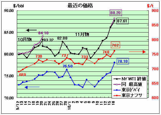 10月16日の東京の原油、ナフサ価格はいずれも上昇し、過去最高を更新した。 ニューヨークのWTI原油価格は一時88ドルを超えた。 東京市場ドバイ原油終値 78.10$/bbl 東京市場オープンスペックナフサ 終値 762$/t NY原油 一時 88.2$/bbl、終値は 87.61$/bbl OPECは16日、原油相場の急騰はファンダメンタルズに基づいていない、原油は十分に供給されているとの声明を発表した。 OECD加盟国の在庫は過去5年の平均水準を上回っており、主因は投機筋の動きであると指摘した。 ![]() |