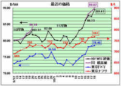 18日のニューヨークのWTI(ウエスト・テキサス・インターミディエート)原油先物相場は、通常取引終了後の時間外取引で一時1バレル=90.02ドルまで上伸し、史上初の90ドル台を記録した。通常取引の終値は 89.47$/bbl で過去最高となっている。