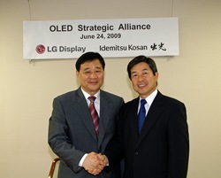 出光興産は24日、韓国のLG Display Co.,Ltd.(LGD)と、次世代ディスプレイとして注目される有機EL(エレクトロルミネッセンス)分野で、高性能ディスプレイを開発するための技術協力及びクロスライセンスを含む戦略的提携関係を構築することに合意したと発表した。 これにより出光は、LGDに対して高性能有機EL材料の提供及びデバイス構成などの提案を行い、ディスプレイ業界大手のLGDを顧客として確保する。一方のLGDは、出光との提携により有機ELの研究、製品開発及び生産を強化、加速させる。 また、両社は、それぞれが保有する有機EL関連特許のクロスライセンスについても合意し、関連特許を自由に利用できるようにする。 両社は有機EL分野におけるシナジー効果を相互に享受し、業界でリーダーシップを発揮するための基盤を構築していきたいとしている。 【出光興産 執行役員・松本佳久電子材料部長のコメント】 今回の戦略提携によって、両社の有機EL事業における取組関係をより強固なものに発展させることを期待している。また出光の有機EL技術をさらに高めることで有機EL関連事業の強化、拡大を図っていきたい。 【LGD Ahn Byung-chul・常務OLED事業部長のコメント】 今回の契約締結はLGDの有機EL事業強化に役立つだけでなく、中長期的にはノートパソコンやTVなど中大型有機EL市場への参入にも大きく貢献する。このようなWin-Winの協力関係は、両社の有機EL事業に大きなシナジー効果をもたらすと期待している。 <用語の解説> ■有機ELディスプレイとは : 有機ELディスプレイとは有機材料に電流を加えることで材料自らが発光する自発光型ディスプレイデバイスのことで、バックライトやカラーフィルターなどが不要なため、部品数を大幅に減らすことができる。そのため、省資源になり製造段階のエネルギー消費も抑制できることが期待されている。また、優れた動画応答性や鮮やかな色表現が可能なため、次世代の薄型ディスプレイとして注目されている。 【 LG Display Co.,Ltd.の概要】 (1)設立 1985年 2月 (2)所在地 Seoul市 Yeongdeungpo-gu、Yeoido-dong 20 (3)CEO Kwon Young-soo (4)資本金 1兆 789億ウォン (2009年 3月末現在) (5)従業員 27,000名 (2009年 3月末現在) ニュースリリース参照 http://www.chem-t.com/fax/images/tmp_file1_1245830177.pdf |