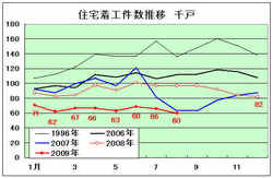 国土交通省は30日、8月の建築着工統計を発表した。それによると、8月の住宅着工は、持家、貸家、分譲住宅ともに減少した。新設住宅着工戸数は 59,749戸で、前年同月比 38.3%減、9か月連続の前年比減少となっている。 2007年6月20日の改正建築基準法の施行に伴う同年8月の大底を更に下回る状況となっている。 (関連グラフは「グラフで見る石油化学」のPVCのページにあります) |