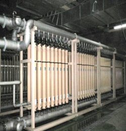 | 旭化成ケミカルズは2日、水の濁度が高い地域での浄水に適した、高透水型浸漬式膜モジュール(製品名:マイクローザ UHS-620A)を開発し、このほど販売を開始したと発表した。主力製品である加圧式膜モジュールに、新型浸漬式膜モジュールを加えて製品ラインナップを充実、浄水用分離膜分野で世界トップシェアを目指す。 水処理用途の分離膜には、低濁度原水に適性のある加圧式膜モジュールと、高濁度原水に適性のある浸漬式膜モジュールの2つのタイプがあり、一般的には低濁度用途を中心に膜の導入が進んできた。 同社の水処理膜「マイクローザ」も、比較的良好な原水を対象としてシェアを伸ばし、すでに世界中の浄水設備600カ所以上で採用実績があってシェアはトップクラスという。 一方、高濁度原水に対しては浸漬式膜モジュールが適しているが、凝集沈殿や砂ろ過などの従来法と比べ、経済性の点で不十分だった。同社の場合も実績は増えても、その範囲は限定されていた。 そこで今回、独自の高次ネットワーク構造のPVDF(ポリフッ化ビニリデン)製中空糸膜を改良し、高透水化し、経済性を高めた新型の浸漬膜モジュールを開発した。 ■新型高透水型浸漬膜モジュールの特長 (1)濁度が高く、また濁度変動が大きい原水に対してもろ過安定性に優れる。 (2)従来からの高次ネットワーク構造のPVDF膜に改良を加え、小孔径化(0.08μm)を図りながら20%~30%の透水性アップを実現した。 (3)独自の充填率の高いモジュール及びラック構造の採用により、約半分の省スペースを実現。 (4)逆洗排水の排水量を低減し、水の利用率を高めるとともに、排水処理の負荷も軽減する。 ニュースリリース参照 http://www.chem-t.com/fax/images/tmp_file1_1267504484.pdf
