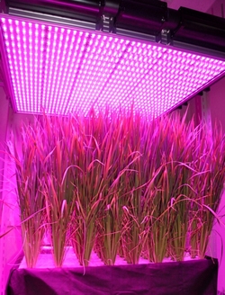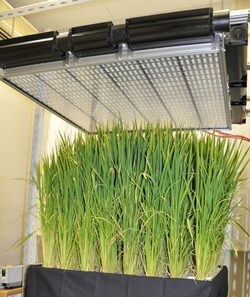 | ウシオ電機100%子会社のウシオライティング(本社:東京都中央区、山中茂樹社長)、昭和電工、千葉大学の3者は4日、世界初となる稲作などに適した「多光量型LED照明ユニット」を共同開発し、千葉大学で運用を開始したと発表した。 昭和電工の独自技術による赤色及び青色LED素子を使い、ウシオライティングが放熱対策を講じた照明ユニットを開発、さらに千葉大学大学院園芸学研究科の後藤英司教授らが稲作などの栽培用として最適化させた。 ウシオライティングは今回、独自のLED実装・放熱技術などにより、これまで実現できなかったLED素子の高電流化に成功し、LED素子の少量化を可能にした。1平方メートル当たり約2,500個という少量のLED素子で、約1,000マイクロモル/秒という高い光量子束密度を達成した(照明距離約20センチ)。