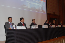アジア各国の石油化学業界代表が集り情報交換など親睦を深める、アジア石油化学工業会議「APIC 2011」本会議は27日、福岡市の国際会議場で開かれた。生憎の空模様だったが、前夜から周辺のホテルに泊まり込んでいた参加者たちは早くから会場に詰めかけていた。 主催団体である石油化学工業協会の高橋恭平会長(昭和電工会長)が「今回の大震災では多くの皆さんからご支援をいただいた」と謝意を述べるとともに「石化業界はダメージは受けたが、サプライチェーンへの影響は少なくて済んだ。今後も産業や経済発展のためにつくしたい」と挨拶。続いて韓国、台湾、インド、シンガポール、タイ、マレーシアの各国代表がスピーチした。小林喜光石化協副会長(三菱化学社長)が進行役を務めた。 キーノートスピーチはBASFチェアマンのJ.Hambrecht博士、三菱総研理事長で前東大総長の小宮山宏氏、日産自動車代表取締役・最高執行役員の滋賀俊之の3氏。それぞれ個性豊かな示唆に富んだ講演を行った。 午後からは共通問題・原料分科会など主要製品ごとに8グループに分かれ、分科会を開催し、活発な意見交換を行った。初となる自動車分科会に注目が集まっていた。 参加登録人員は1417人と予想を上回った。 高橋会長は「震災の後にもかかわらず内外から多くの人が集まってくれた。日本の業界にとっても大会を通じてアジアにおけるプレゼンスがアピールできたと思う」と感想を語った。 大会では最後に、「我々石油化学産業は今後も地域に暮らす多くの人々の利便性、快適性、衛生面等、生活の質の向上に貢献し、人類の幸福と繁栄の実現に大きな役割を果たすことを目指す」とする内容の共同宣言を採択した。 次回は2012年5月、マレーシア・クアラルンプールで開催。 |