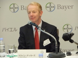 ドイツのマライン・デッカーズ・バイエル社長は22日都内で記者会見し「日本市場はバイエル全体にとって、ドイツ以外では3番目の売上高を計上しており、今後も最重要市場の一つである」とし、「全事業グループのビジネスにおいて日本は今後も成長が期待できる」と強調した。 日本市場でのバイエルの年間売上高は2011年に21億4200万ユーロで前年比5%台の成長となり、2012年1-9月は16億7900万ユーロと成長を続けている。分野別にみると、ヘルスケア分野が約70%、残りを素材科学と農薬関連が占めているという。 また、デッカーズ社長は「2013年も大きな成長を見込んでおり、2017年まで年平均7%以上の成長を目指す」ことを明らかにした。 具体的には「2017年までに日本市場で売上高を約30億ユーロ(約3300億円)に拡大していく。このために、2013年から2017年の間に合計約5億ユーロを日本市場の開発活動に投資する」と強調した。 |