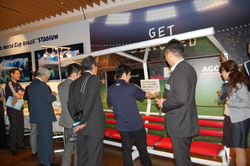 ワールドカップ・ブラジル大会の開催に協賛して、全12会場にガラスルーフベンチを提供した旭硝子は、タイかい開催を2日後に控えて10日、東京・港区の六本木ヒルズに設けられた「FIFAワールドカップ特設カフェ」でサッカー会場で使用されるのと同じガラス屋根のベンチをマスコミ関係者に公開した。 展示されたベンチは、いかにも明るく、軽快で、丈夫そう。座席には赤いポリウレタン製のシートが配置され、すっきりしたデザイン。シートは座り心地がよく、立ち上がるのがいやになるほどだった。 プレイヤー用ベンチには左右に23の赤いシートが並ぶ。高さ1.9メートル、 左右の長さ11.5メートル、奥行き1.0メートル、重さは760キロ。全12会場に選手用をはじめ審判用、救護スタッフ用など大小5台のベンチを提供した。 使用した化学強化ガラスは、普通の窓ガラスに比べて約8倍の強度がある。屋外で使用しても風やキズに強い、長期間使用しても変形・変色・劣化せず、クリアな視界を保つ、などの特徴がある。ほかにも低反射コーティング技術や、フッ素系の超高耐候性塗料用樹脂、透明性、衝撃性に優れたポリカーボネート樹脂など最先端のテクノロジーを結集した。 ジャパン・ブルーのユニフォーム姿で現れた石村和彦社長は、「日本チームを応援しましょう」と挨拶、もう大会が始まっているような盛り上がりをみせていた。 |