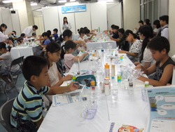 「夢・化学・21」委員会(日化協、日本化学会など4団体)は1、2の両日、小学生を対象にした無料化学実験体験イベント「夏休み子ども化学実験ショー」を東京・北の丸公園の科学技術館で開催した。 会場には猛暑の中、2日間で約6000人の親子が参加し、実験やイベントショーを楽しんだ。 この企画は、いまの子どもたちに、もっと化学に親しみ“楽しさやスゴさ”を体験してもらおうと毎年夏休み期間中に開催しているもので今年で21回目。 協賛の大手化学メーカー16社が「スキンクリームをつくってみよう/暮らしの中の乳化」(写真)、「ポリエチレンフィルムで万華鏡をつくろう」、また、「冷却パック」や「動くスライム」、「光るバッジ」をづくろうなど、ふだん学校ではできない色とりどりの実験教室を用意して子どもたちを迎えた。 子どもたちは、忙しく各教室を回り「化学」に触れて楽しんだ。ステージでは「化学クイズ」に挑戦し、マジック仕掛けのような「化学実験ショー」に見とれていた。 |
