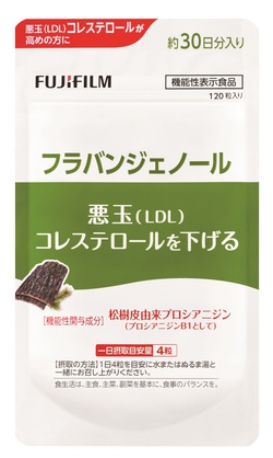 富士フイルムは、悪玉コレステロールを下げる効果のある機能性表示食品として、20日から「フラバンジェノール」を発売した。機能性関与成分「松樹皮由来プロシアニジン」を、1日の摂取目安量4粒あたりに2.46mg配合しており、悪玉コレステロール値を低下させる機能がある。 コレステロールには、悪玉(LDL)と善玉(HDL)の2種類があり、悪玉(LDL)コレステロール値が上昇すると、生活習慣に起因する身体トラブルが発生するリスクが高くなるとされる。だが、ふだんは数値を自覚することが少なく、健康診断などで初めて知ることが多いため、日々の健康管理が大切となる。 今回発売した「フラバンジェノール」は、松の樹皮から抽出される素材に含まれるポリフェノールの一種「松樹皮由来プロシアニジン(プロシアニジンB1として)」を機能性関与成分として配合した。悪玉(LDL)コレステロールが高めの人には悪玉(LDL)コレステロール値を低下させる機能がある。健康食品のGMP認証を取得した工場で製造。錠剤の直径が約8mmと小さいため飲みやすい。 販売価格は、容量 120粒(約30日分)入り:3,300円+税。 ニュースリリース http://www.chem-t.com/fax/images/tmp_file1_1534726047.pdf |